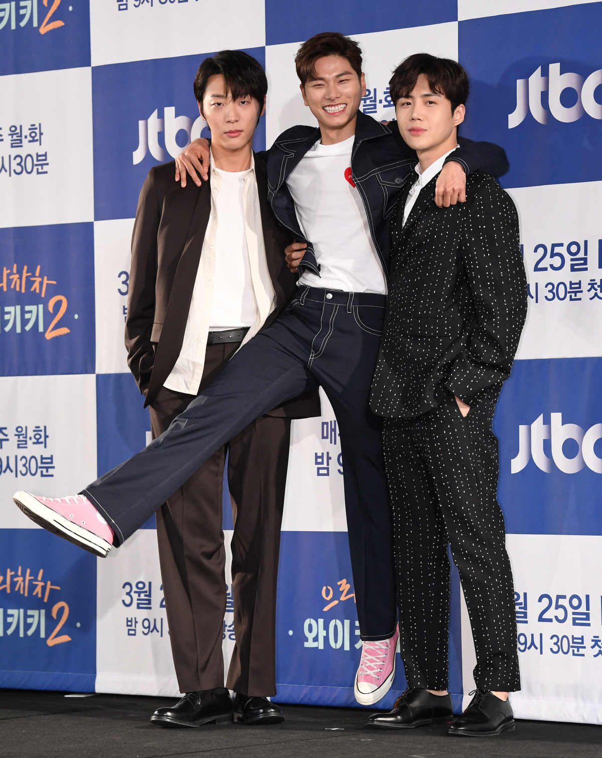 JTBC 새 월화드라마 '으라차차 와이키키2'의 제작발표회가 25일 서울 여의도 콘래드호텔에서 열렸다. '으라차차 와이키키2'는 대환장의 수맥이 흐르는 게스트하우스 '와이키키'에 다시 모여들고만 청춘들의 우정과 사랑, 꿈을 위한 도전을 유쾌하게 그린다. 포토타임을 갖는 신현수 이이경 김선호의 모습. 여의도=허상욱 기자 wook@sportschosun.com/2019.03.25/