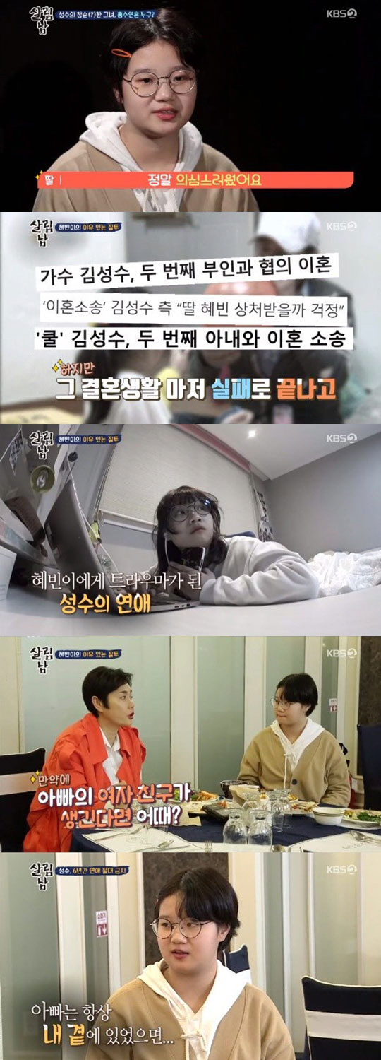 하지만 김성수는 2014년 재혼했다가 1년 만에 이혼, 다시금 딸에게 큰 상처를 안기고 말았다. 김성수는 "뭔가에 홀린 것처럼 절실해서 만난지 두달도 안돼 재혼했다. 결국 실패했다"면서 "혜빈이에게 여자의 손길이 필요하다고 생각했다. 제 잘못"이라고 고백한 바 있다.