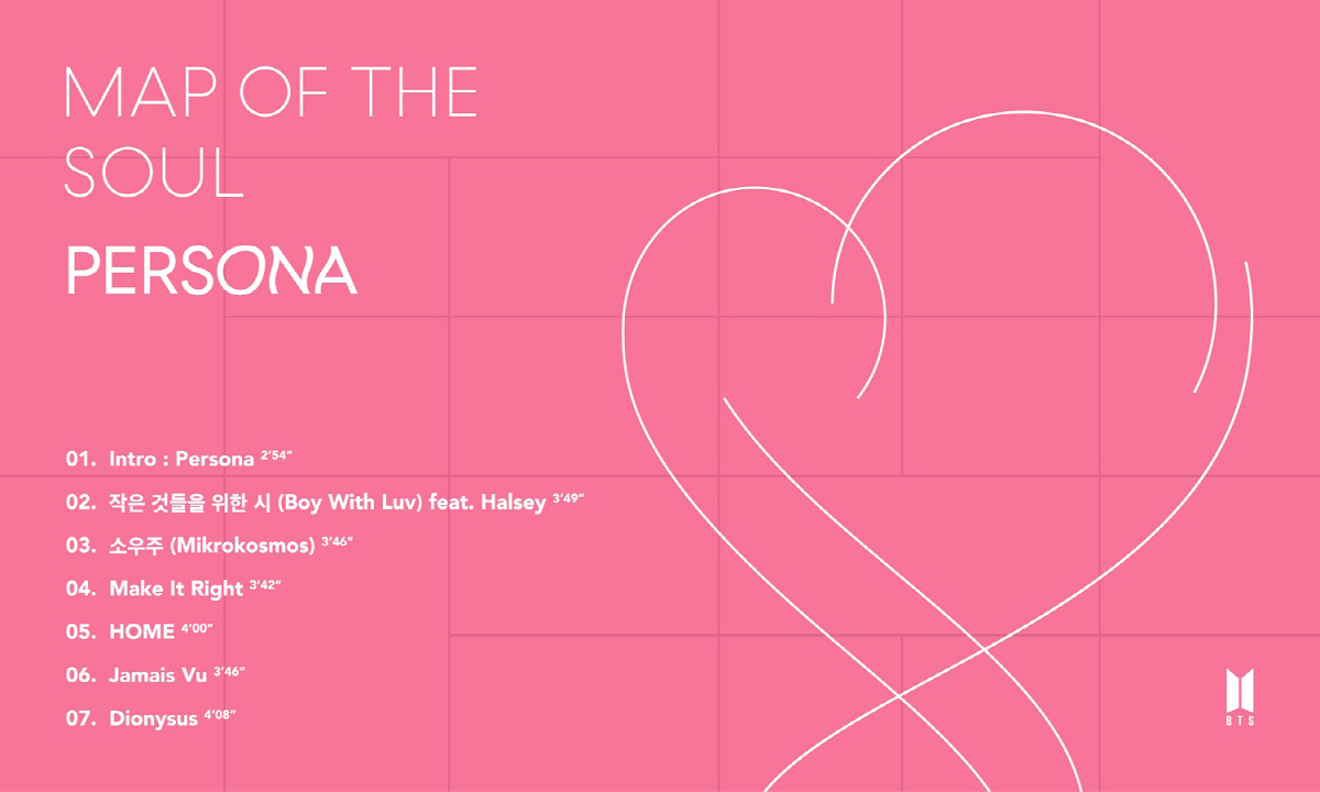방탄소년단은 오늘(9일) 0시 공식 팬카페와 SNS 채널을 통해 새 앨범 '맵 오브 더 소울 : 페르소나(MAP OF THE SOUL : PERSONA)'의 트랙리스트를 공개했다.