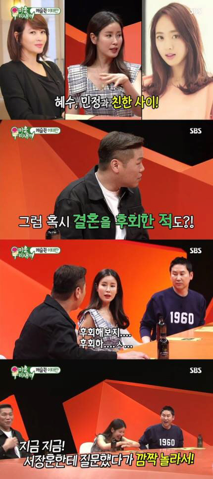이날 MC신동엽은 이태란과 배우 김혜수, 김민정과의 우정을 언급했다. 세 사람은 절친한 사이라고. 이태란은 "싱글인 두 분에게 결혼을 추천하는 편이냐"는 질문에 "신기한 게 만나면 결혼 이야기는 안 하게 된다. 지금도 충분히 멋있으신 분이다. 혼자 사는 게 외롭지 않으면 혼자 사는 것도 나쁘지 않은 것 같다"며 결혼을 적극 권장하진 않는다고 밝혔다. 이어 이태란은 "결혼을 후회한 적 있냐"는 MC 서장훈의 질문에 "후회한 적 다들 있지 않냐"고 되묻다 급하게 고개를 돌려 웃음을 자아냈다. 특히 신동엽은 "지금 서장훈 보다가 깜짝 놀랐다. 이 장면 개인소장 할 거다"라며 폭소했다. 당황한 이태란을 위해 서장훈은 "공식적으로 후회하게 됐다"고 이혼을 간접적으로 언급했다.