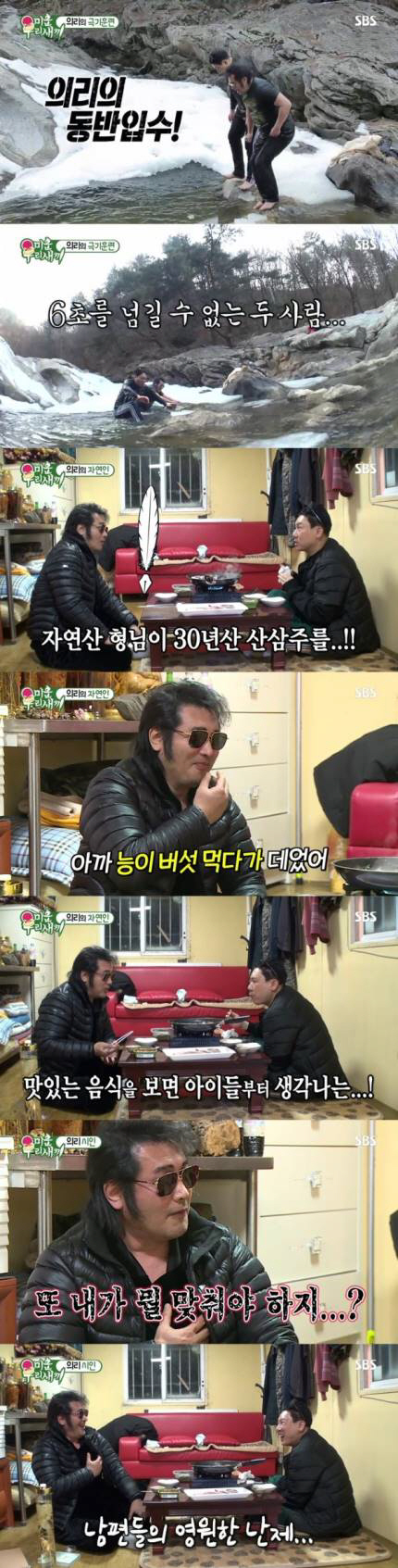 자연인 체험에 나선 이상민과 김보성은 무모한 얼음 계곡물 입수로 시청자들을 놀라게 했다. 생각보다 차가운 얼음물에 두 사람은 머뭇거렸고, 곧 이상민이 "죽는 날까지 그 어려움도 꿋꿋이 이겨내겠다"고 외치며 입수했다. 이를 본 김보성도 뛰어들어 '6초 입수'에 성공했다. 숙소로 돌아온 두 사람은 삼겹살에 능이버섯, 30년 된 산삼주를 곁들여 먹으며 추위를 녹였다. 김보성은 "맛있는 음식을 보면 아이들이 생각난다"며 자작시 '아들에게'를 읊었고, 감성에 젖어 자신의 자작시 노트까지 공개했다. 이에 이상민은 "형수님 시는 없냐"며 김보성의 아내를 언급했고, 김보성은 "요즘 아내가 무섭다"고 뜬금없이 고백해 웃음을 자아냈다.