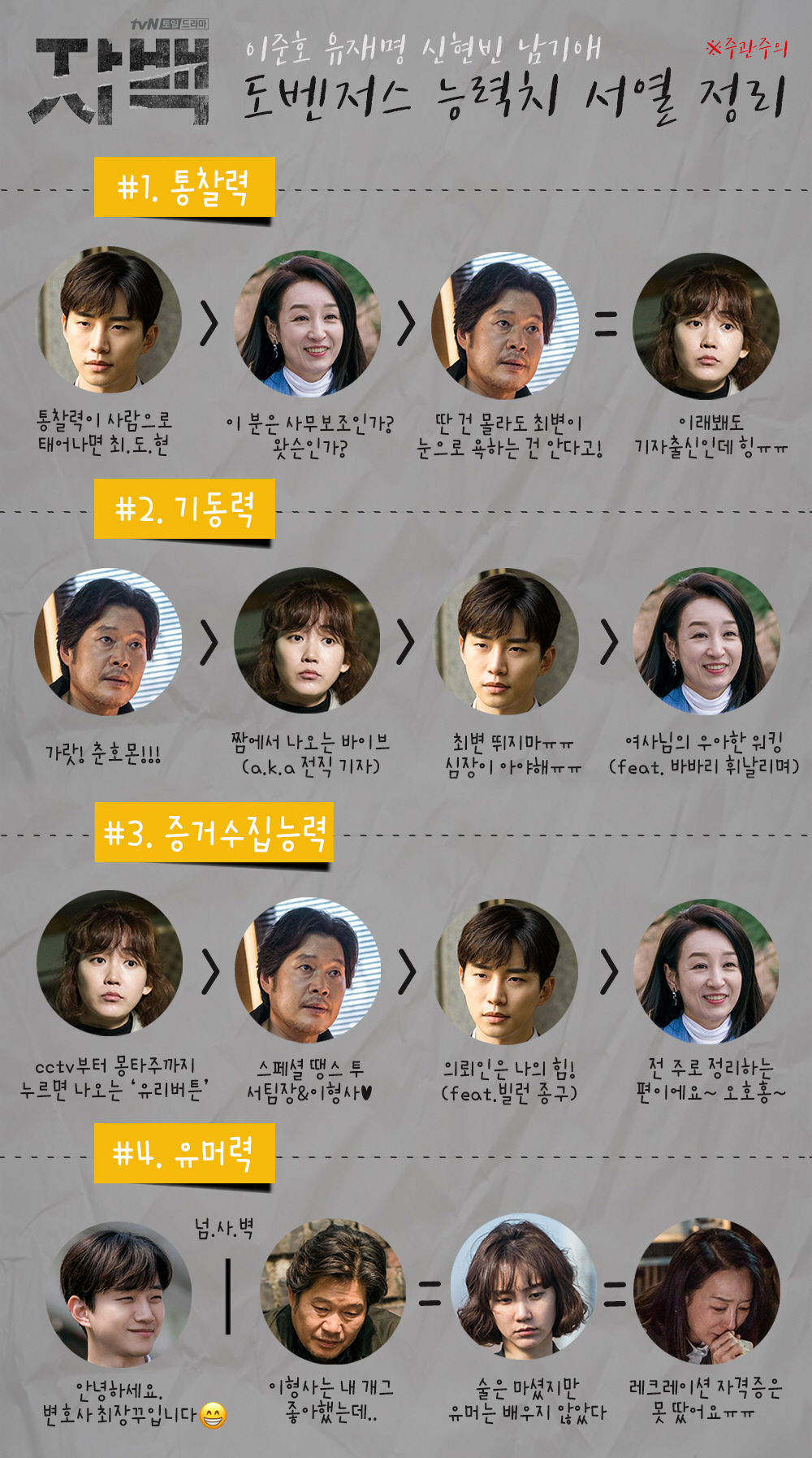 tvN 토일드라마 '자백'(연출 김철규 윤현기/극본 임희철/제작 스튜디오드래곤, 에이스팩토리)이 한 순간도 눈을 뗄 수 없는 몰입도로 매회 호평을 이끌어내고 있다. 특히 지난 8회에서는 최도현(이준호 분)-기춘호(유재명 분)-하유리(신현빈 분)-진여사(남기애 분)가 4인 공조체제를 갖추며 뜨거운 호응을 이끌어냈다. 이에 시청자들은 네 사람의 구심점인 '최도현'의 이름과 어벤저스를 합해 '도벤저스'라 칭하며 이들의 진실 추적에 응원을 보내고 있는 상황. 이 가운데 '자백' 측이 '도벤저스'의 결성을 기념해 네 사람의 능력치 서열 분석표를 공개해 이목을 집중시킨다.