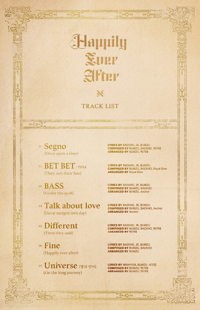 소속사 플레디스 엔터테인먼트는 오늘(23일) 0시 뉴이스트 공식 SNS 채널을 통해 뉴이스트의 미니 6집 앨범 'Happily Ever After(해필리 에버 애프터)'의 트랙리스트 이미지와 함께 타이틀곡 명 'BET BET'을 최초 공개했다.