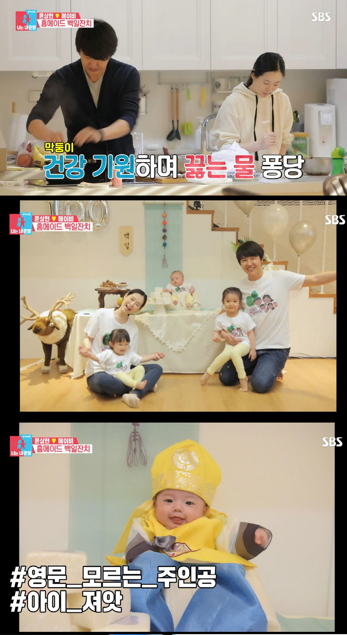 윤상현은 마트에서 백일상을 위한 장을 봤다. 다양한 과일과 음식을 산 뒤, 떡집으로 가 미리 주문했던 백설기와 수숫가루, 찹쌀가루를 사 왔다. 집으로 온 윤상현은 나겸, 나온이와 함께 수팥떡을 만들기 시작했다. 또한 윤상현은 온라인에서 셀프 백일상을 대여해 야심차게 준비를 했으나 좋아 보였던 완성 사진과는 달리 텅 빈 테이블을 손수 꾸려나가야 한다는 현실을 알게 됐다. 결국 윤상현은 "100일 하지 마. 돌잔치나 해"라며 '양은 냄비' 같은 분노 폭발해 웃음을 안겼다.