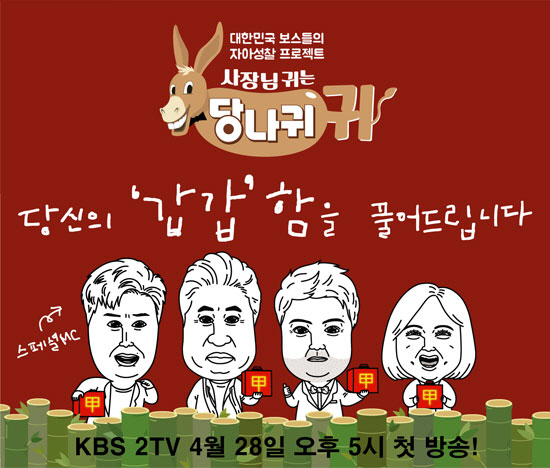 오는 28일 첫 방송되는 KBS 2TV 예능 '사장님 귀는 당나귀 귀'(이하 '당나귀 귀')(연출 이창수)는 대한민국 각계 각층을 대표하는 '셀럽' 보스들과 '미생' 직원들의 일터와 일상 속 동상이몽을 돌아보는 역지사지X자아성찰 예능 프로그램.