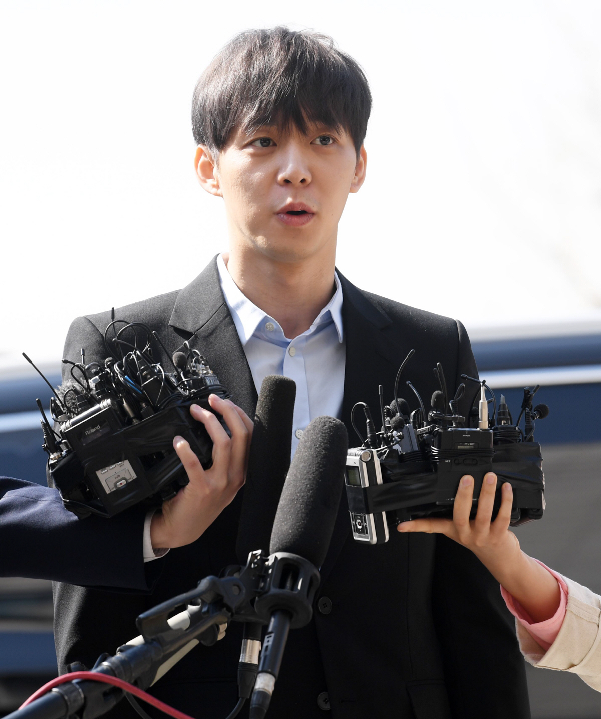 마약을 투약한 혐의를 받는 가수 박유천이 17일 경기지방경찰청에 출석했다. 박 유천은 마약 투약 혐의로 구속된 남양유업 창업주의 외손녀 황하나 씨와 함께 필로폰을 투약한 혐의를 받고 있다. 취재진의 질문을 받는 박유천의 모습. 수원=허상욱 기자 wook@sportschosun.com/2019.04.17/