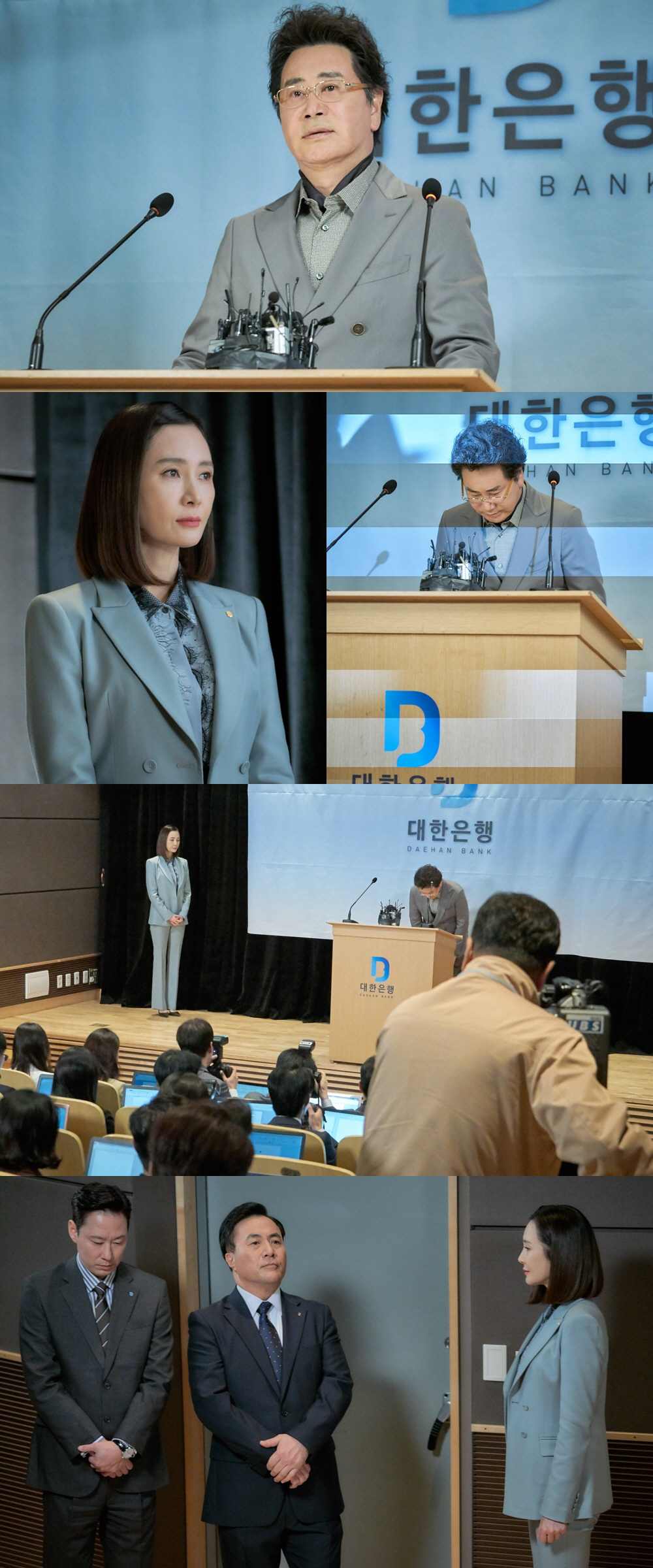 그런가 하면 부행장으로 파격 승진한 한수지(채시라 분)가 기자회견 내내 강행장을 밀착 케어하고 있어 시선을 끈다. 그녀는 기자들 앞에서 고개 숙이는 강행장의 모습을 지켜보며 곁을 꿋꿋이 지키고 있어 이목을 집중시킨다.