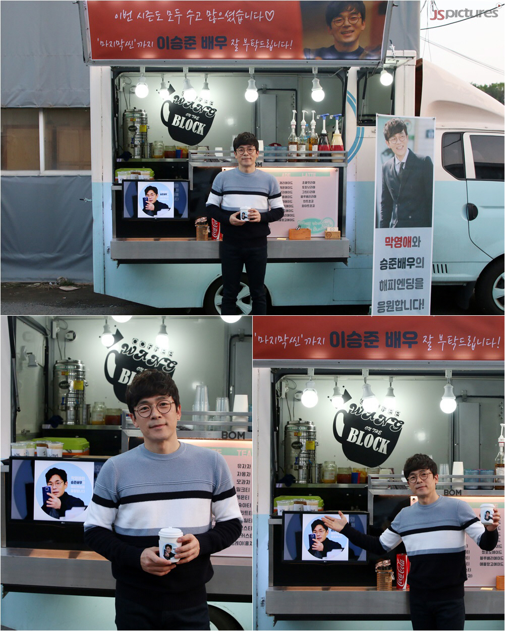 사진에는 어제(24일) 진행된 '막영애' 이번 시즌의 마지막 촬영과 종영을 앞둔 이승준을 비롯 전 배우와 스탭들을 독려하기 위해 전해진 커피트럭 선물과 그에 대한 보답의 마음을 담은 이승준의 모습이 담겨 있다.