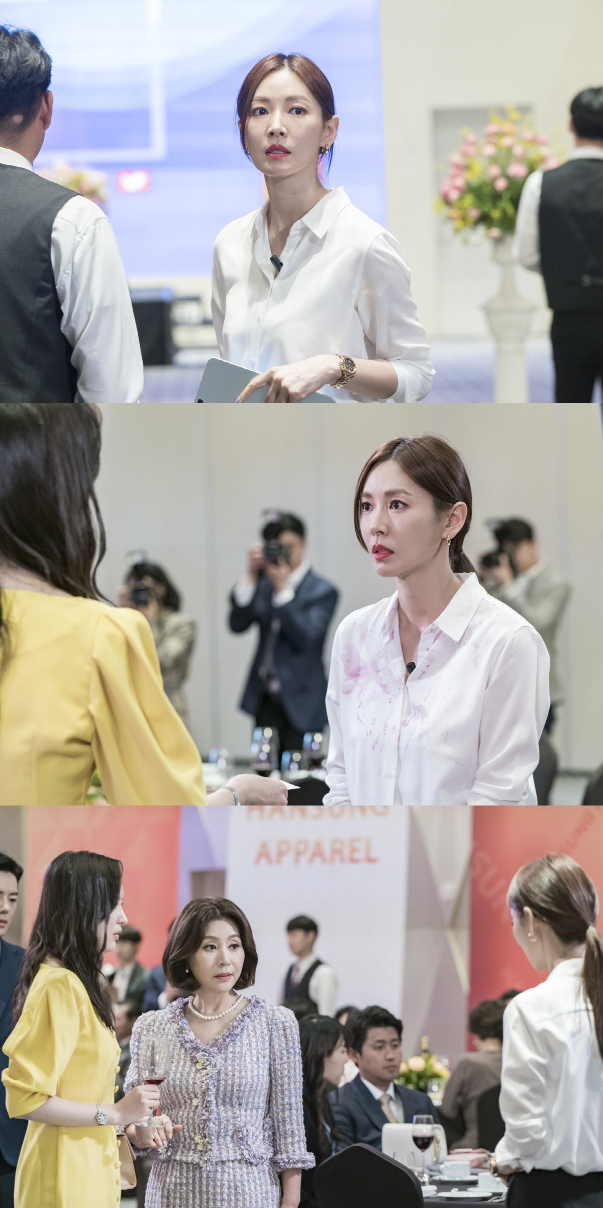 사진 속에는 강미리(김소연 분)가 한성 어패럴 창립 40주년 기념식를 앞두고 행사장을 꼼꼼하게 체크하는 프로페셔널한 모습이 담겨있다. 이런 가운데 낯선 여인과 부딪혀 와인을 뒤집어 쓴 모습이 포착돼 눈길을 끈다. 놀란 강미리의 표정에서는 당황스러움이 느껴져 예상치 못한 상황에 궁금증이 쏠리고 있다.