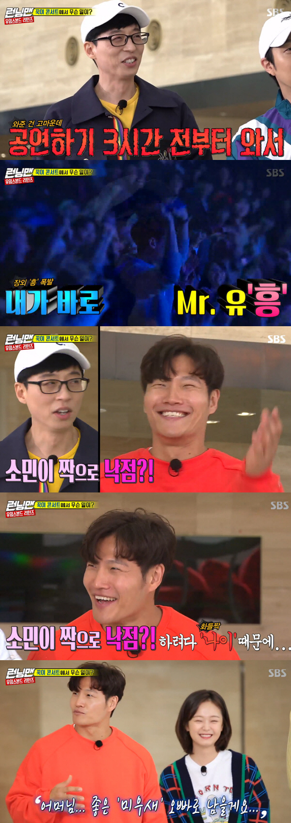 김종국은 "멤버들이 다 와줬다"며 고마움을 드러냈다. 그는 "재석이 형은 공연하기 3시간 전부터 와서 '게스트 내가 하면 안되겠냐'고 하더라"며 "결국 안했는데 혼자 춤 추다 걸렸다"고 말해 웃음을 안겼다. 이후 유재석은 객석에서 '흥'을 폭발시켰다.