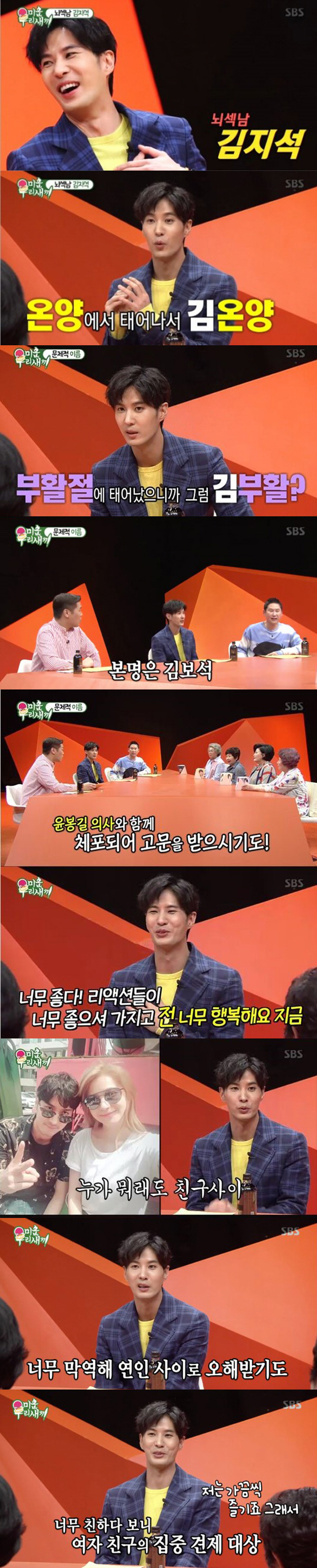 김지석은 절친인 동료료 유인영을 꼽았다. 유인영과 10년 넘은 절친이라는 그는 너무 막역해 연인 사이로 오해를 받기도 했다고 말했다. 김지석은 "인영 씨가 워낙 매력적이고 예뻐서 그런 것 같다"면서 "이성적인 호감을 느끼는 시기는 이미 지났다"고 선을 그었다. 그러면서 "너무 친하다 보니 여자 친구의 집중 견제 대상이었다"며 "질투 유발해 가끔 즐겼다"며 웃었다.