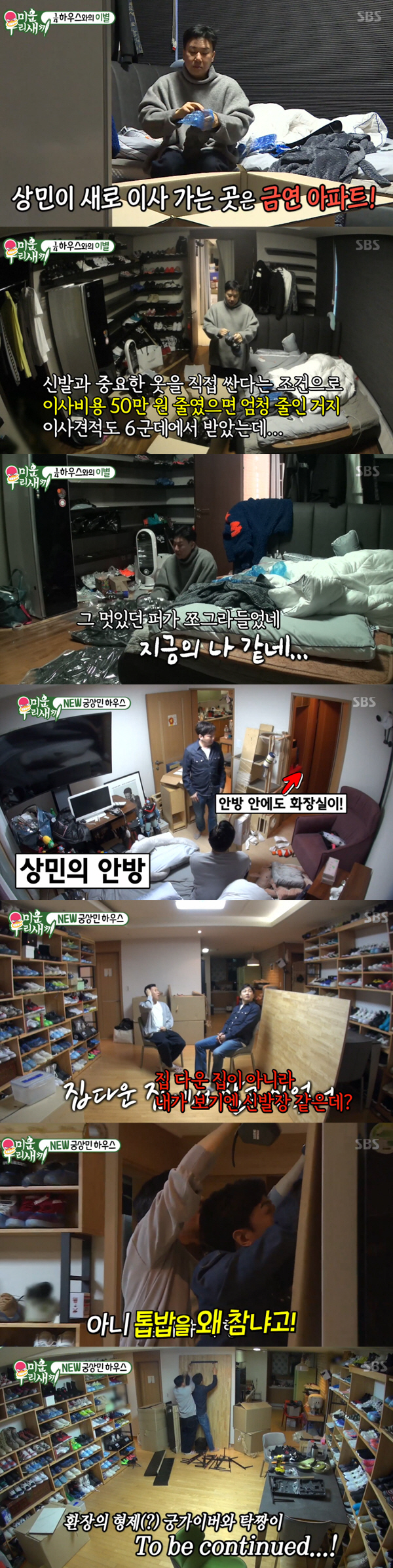 이상민은 '보물 1호' 신발들을 박스에 넣는가 하면, 털 코트를 입고 온 집을 돌아다니는 등 평소와 다른 아침을 맞았다. 알고 보니, 2년 동안 살았던 1/4 하우스를 떠나 새 집으로 이사를 가게 된 것.