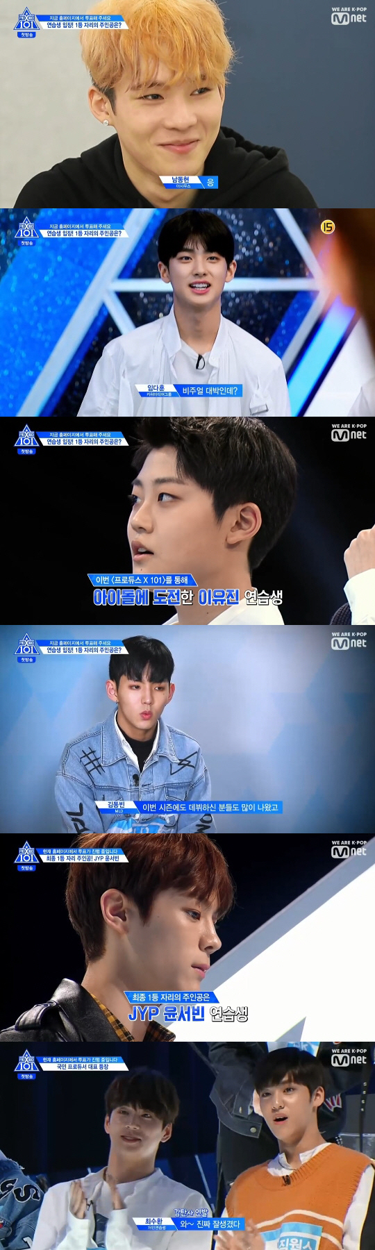 이날 '프로듀스X101'의 100일 여정을 함께할 연습생들이 등장했다. 이번 시즌에는 빅톤 최병찬과 한승우, 마이틴 김국헌과 송유빈, 업텐션 김우석과 이진혁이 연습생으로 돌아왔다. '프로듀스 시즌2'에 출연했던 김동빈은 재도전에 나섰고, 남태현의 남동생 남동현도 출연했다. 9명의 개인 연습생 중에는 드라마 'SKY 캐슬'을 통해 얼굴을 알린 이유진도 있었다. 이번 시즌의 최종 1등 자리는 여러 번의 밀어내기 끝에 마지막에 등장한 JYP 윤서빈이 차지, 본방송 1분 단독 PR권을 획득했다.