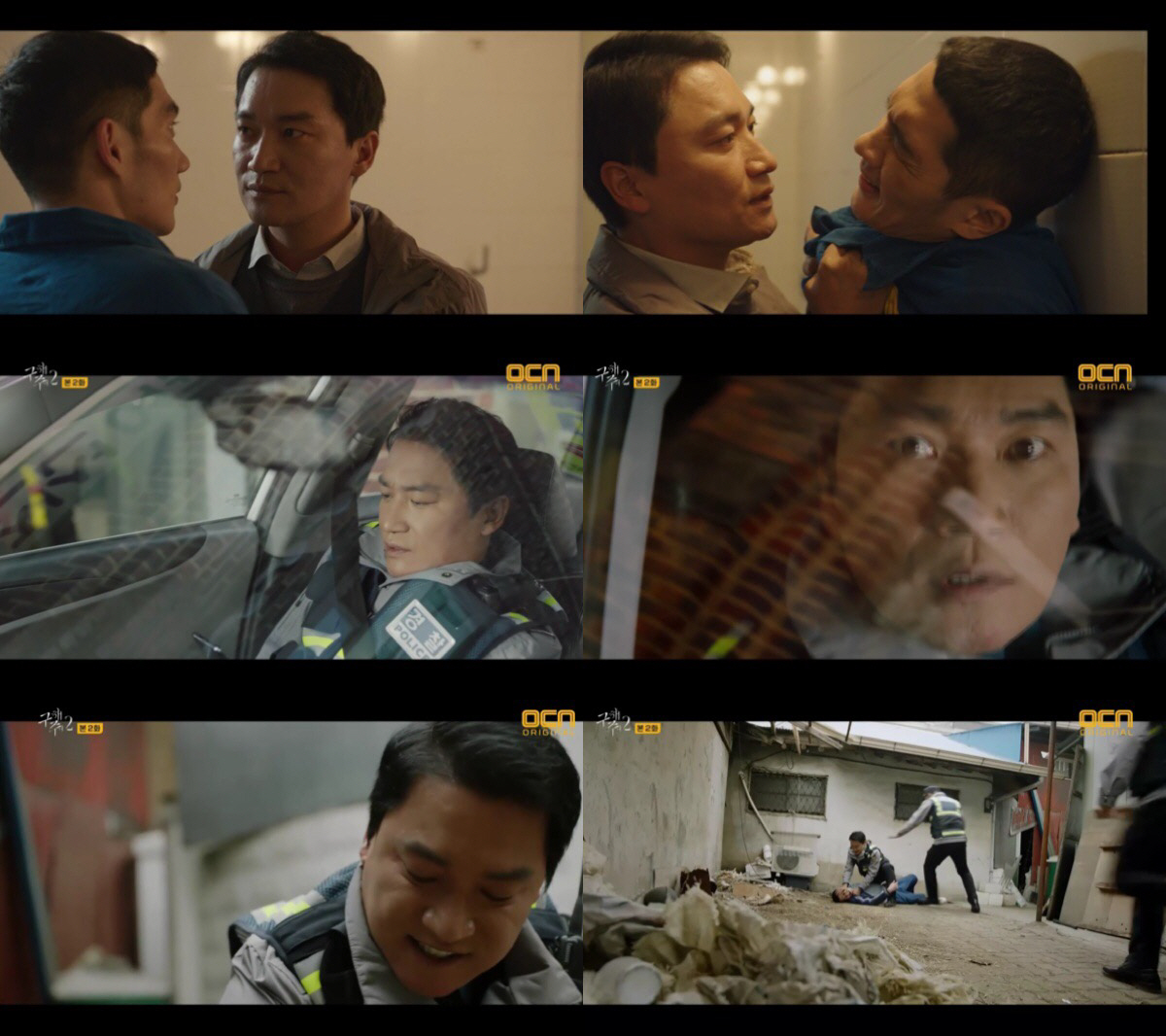 9일 방송된 OCN 수목 오리지널 '구해줘2' 2회에서는 월추리에 교회를 설립하며 자리 잡게 된 성목사(김영민 분)와 최장로(천호진 분), 그리고 18년 만에 마을에서 아기가 태어나는 모습이 그려진 가운데 파출소장 신필구(조재윤 분)와 김민철(엄태구 분)의 악연이 이어졌다.