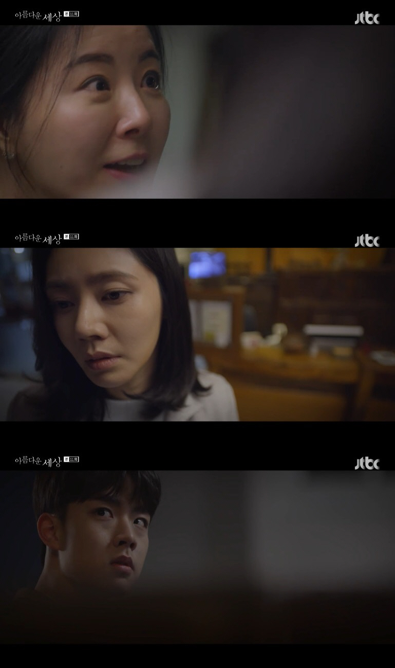 10일 방송된 JTBC 예능프로그램 '아름다운 세상'에서는 다희 엄마에게서 뜻밖의 이야기를 들은 강인하(추자현 분)·박무진(박희순 분) 부부의 이야기가 그려졌다. 이날 다희 엄마(최유송 분)는 "당신 아들(박선호)이 우리 애를 성폭행했다"며 박선호(남다름 분)가 피해자가 아닌 또 다른 사건의 가해자라 주장했다. 다희 엄마는 "뿌린 대로 거둔 거다. 선호가 잘못됐다는 거 알고 통쾌했다"고 말했고, 다희 아빠(이서환 분) 역시 "우리 애가 얼마나 무서웠으면 공황장애에 실어증까지 걸렸다"고 분노했다. 다희 엄마는 "당신들이 얼마나 추악한 지 알리고 싶어도 우리 딸 때문에 참는 거다. 내 딸은 살아야 하니까"라며 오열했다. 충격에 빠진 강인하는 멍하니 돌아섰고, 구역질까지 했다. 박무진은 "우리 선호가 그럴 리 없다. 뭔가 잘못됐다"고 말했지만 강인하는 바닥에 주저 앉을 뿐이었다.