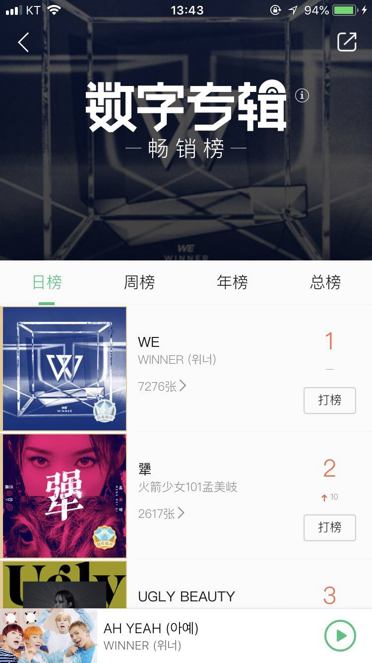 위너의 새 미니앨범 'WE'는 16일 중국 최대 음원사이트 QQ뮤직 유료 디지털 앨범 판매 일간 차트와 주간 차트에서 나란히 1위를 석권했다. 'QQ뮤직'은 중국 대표 디지털 음원서비스로서, 월 사용자가 4억명에 달하는 플랫폼이다.
