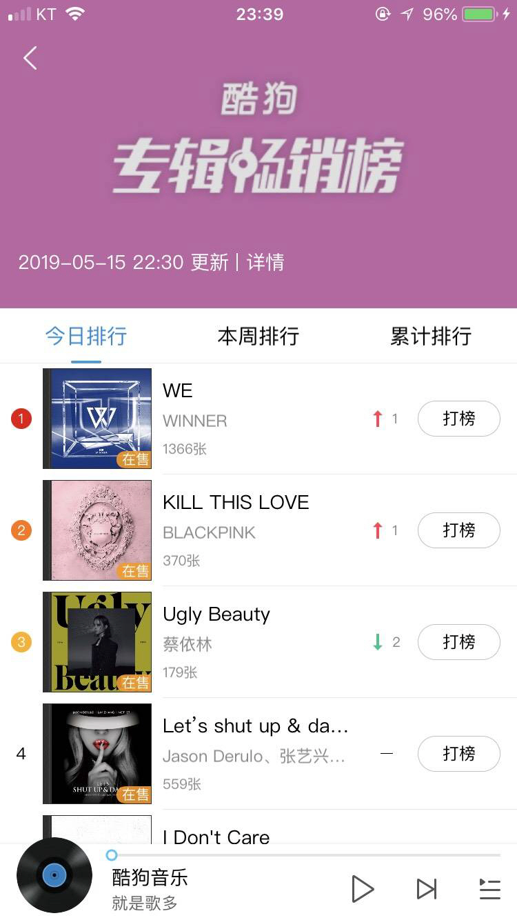 위너는 신보 'WE'로 또다른 중국의 대규모 음원사이트 쿠거우 뮤직과 쿠워 뮤직의 유료 디지털 앨범 판매 일간 차트와 유료 디지털 앨범 판매 주간 차트에서도 1위를 달성했다.