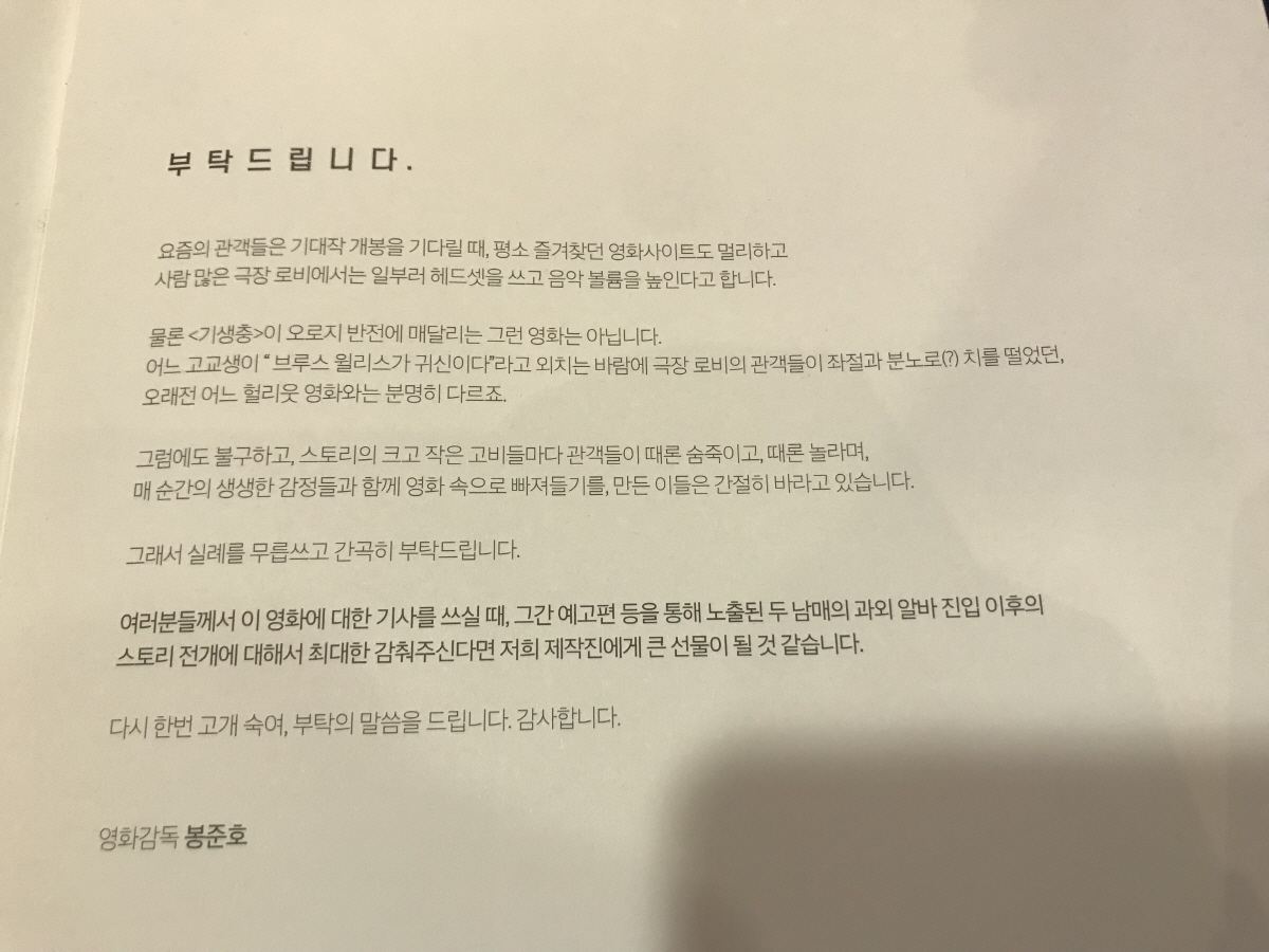 그는 "그래서 실례를 무릅쓰고 간곡히 부탁드린다. 여러분은 이 영화에 대한 기사를 쓸 때, 그간 예고편 등을 통해 노출된 두 남매(최우식·박소담)의 과외 알바 진입 이후의 스토리 전개에 대해서 최대한 감춰주신다면 저희 제작진에게 큰 선물이 될 것 같다"고 당부했다.