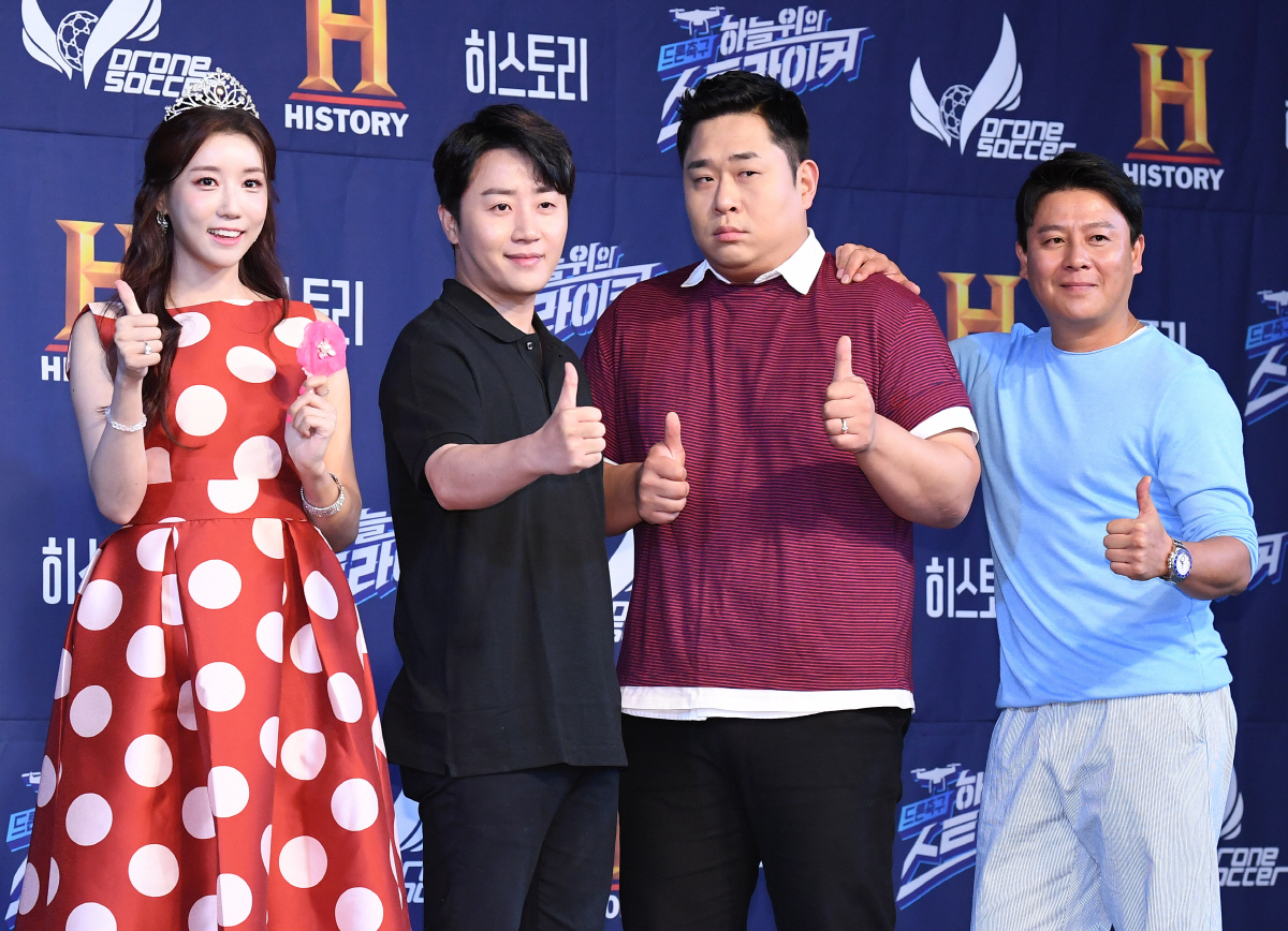 21일 서울 마포구 가든호텔에서 히스토리 채널 신규 예능 프로그램 '드론 축구: 하늘위의 스트라이커' 제작발표회가 열렸다. 제작발표회에 참석해 포즈를 취하고 있는 두리, 홍진호, 문세윤, 이재훈. 마포=송정헌 기자 songs@sportschosun.com/2019.05.20/