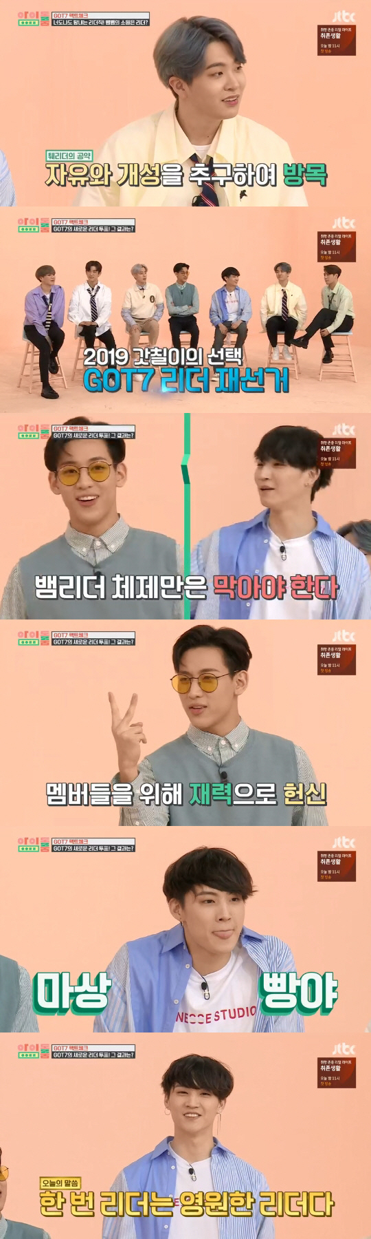 이로 인해 '태국 왕자' 위엄을 뽐낸 뱀뱀과 "무조건 뱀뱀은 막아야 한다"고 나선 JB만 대결을 펼치게 됐다. 이어진 개표에서는 손에 땀을 쥐게하는 접전이 펼쳐졌다. 한 표 차로 리더 재신임을 하게 된 JB는 온몸으로 기쁨을 표출했다. 그는 "한 번 리더는 영원한 리더다. 믿어주셔서 감사하다"며 소감을 밝혔다. 하지만 이내 뱀뱀을 뽑은 사람들을 찾아내는 뒤끝있는 모습으로 웃음을 자아냈다.