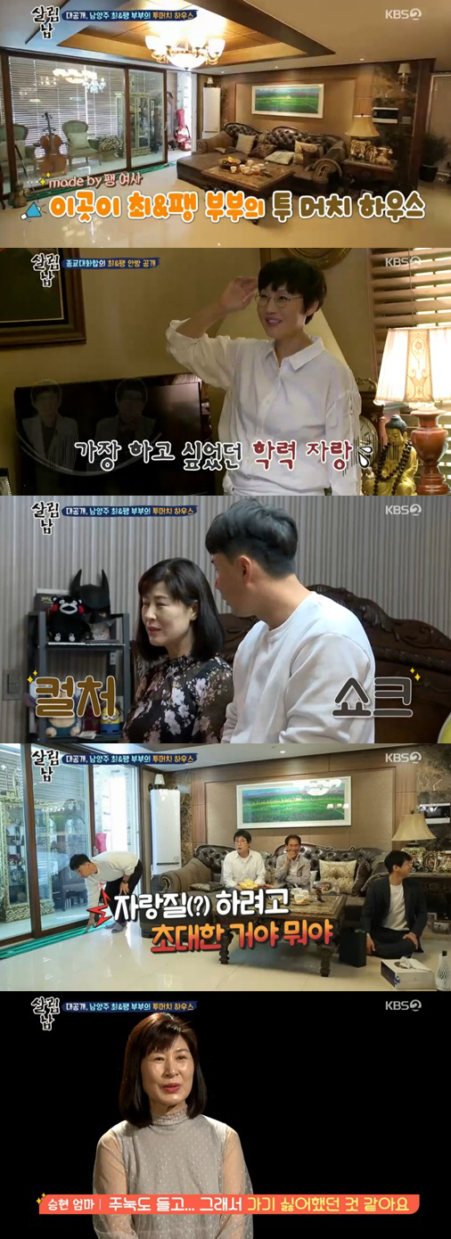김승현 가족들은 최양락-팽현숙의 넓은 집과 고풍스러운 인테리어에 눈이 휘둥그레졌다. 팽현숙은 이런 마음을 아는지 모르는지 어머니의 손을 붙잡고 집안 곳곳을 다니며 집자랑과 자식자랑 삼매경에 빠졌다.
