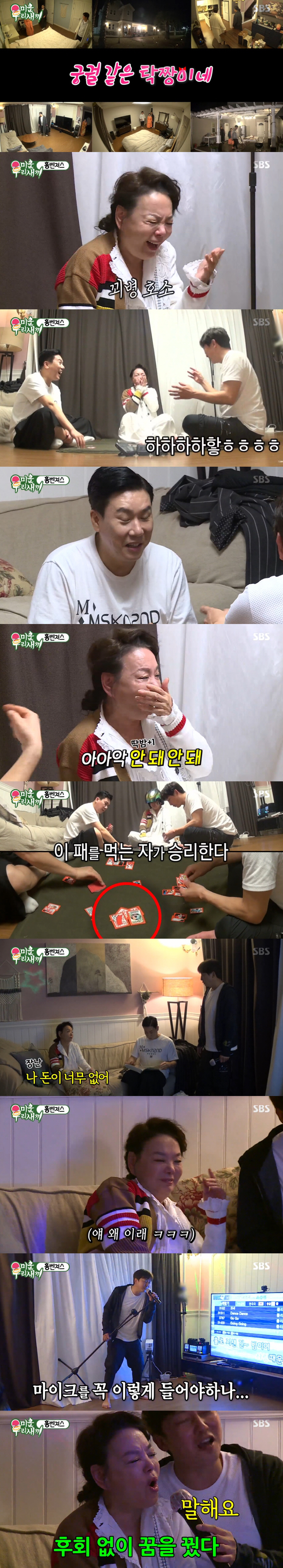 하지만, 잠시 후 수미는 한국어를 쓰며 어마어마한 후폭풍을 정통으로 맞게 돼 모두를 웃음바다로 만들었다. 기세등등하던 자칭 타짜 김수미가 아들 격인 재훈에게 싹싹 비는 사태까지 발생했다. 이어 세 사람은 고스톱에 이어 한밤 중 노래자랑을 열기도 했다.