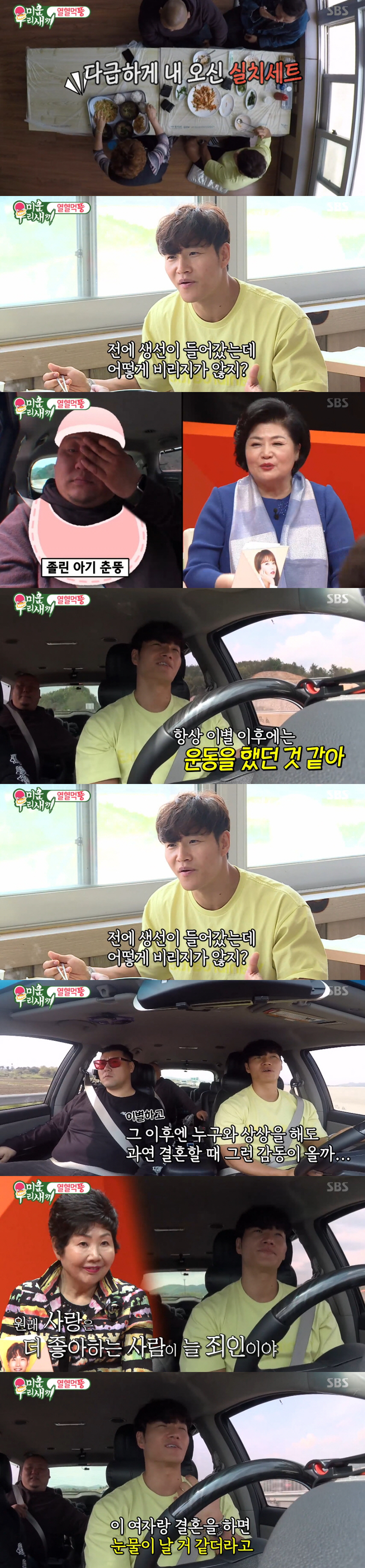 먹방을 마친 후 김종국과 뚱브라더스는 다음 장소로 이동했다. 갑뚱은 식후 졸음을 쫓고자 김종국 6집의 '내 마음이 사랑입니다'을 선곡했다. 그러면서 이 곡에 대해 "결혼하면 내가 축가를 해주고 싶었다"고 말을 꺼냈다. 그러자 김종국은 "님은 갔습니다"라고 말해 눈길을 모았다.