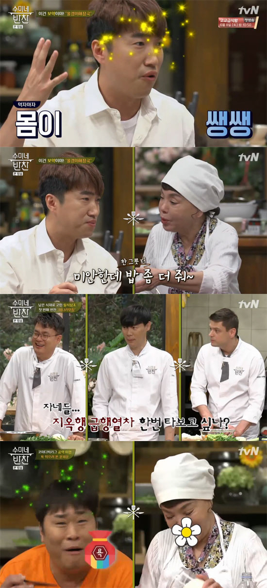 이어 김수미는 미나리 하나로 '미나리 무침', '미나리 전', '미나리 계란말이' 등 3가지 요리를 뚝딱 만들어냈다. 특히 이날 요리를 하던 중 갑자기 스튜디오에 개그맨 문세윤이 깜짝 등장했다. 알고보니 '코미디빅리그'에서 "장동민과 김수미 선생님께 맛있는 욕을 먹고와라"는 미션을 받은 것. 이를 알게된 김수미는 시원하고 맛있는(?) 욕을 아낌없이 발산했고, 맛있게 먹은 문세윤은 "간이 딱맞네", "여기 맛집이다"라며 흡족한 표정을 지었다.