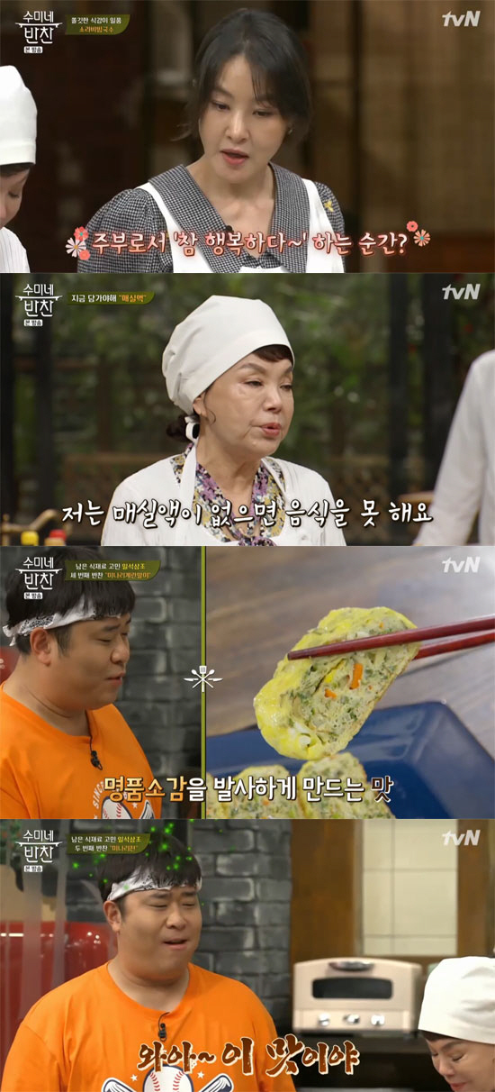 한편 김수미는 "저는 매실액이 없으면 요리를 못한다"라며 '매실청'을 담그는 팁을 공개했다. 6월이 제철인 매실은 물기가 없이 말린 상태로 유리병에 담아 1:1 비율로 켜켜이 쌓는다. 특히 켜켜이 쌓은 설탕 위에 올리고당을 0.1의 비율로 더하는 특별한 비법을 공개해 눈길을 끌었다.