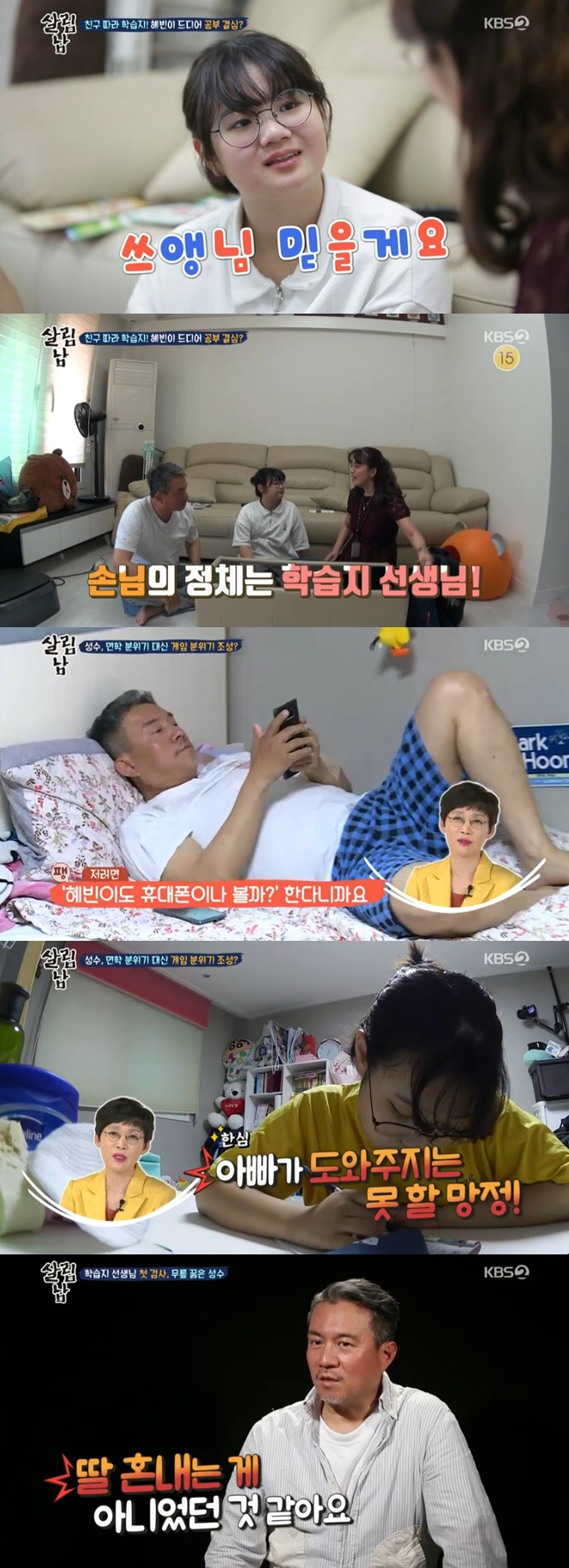 집에 방문한 학습지 선생님은 혜빈이에게는 숙제를 내주었고 김성수에게는 혜빈을 위해 면학 분위기를 조성해달라고 부탁했다. 그동안 공부하고는 담을 쌓고 지내던 혜빈은 곧바로 공부를 시작했고 김성수는 혜빈의 곁에 있어주었다.