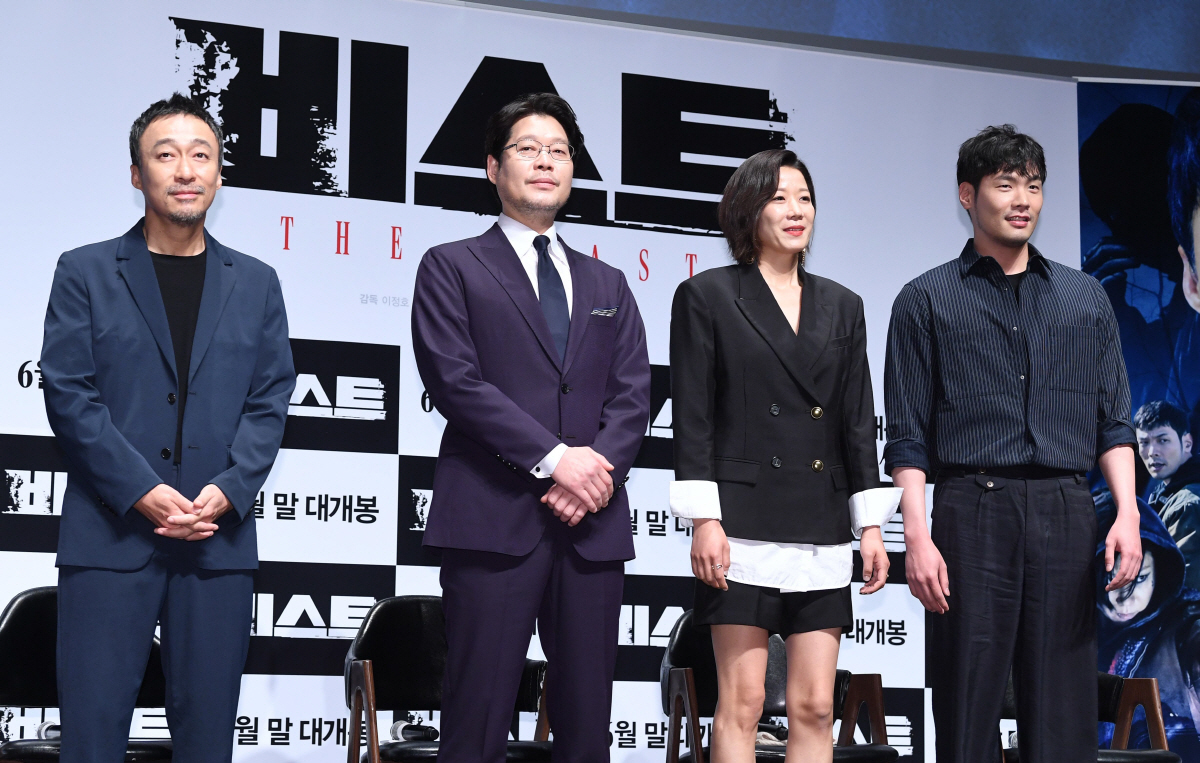 30일 오전 서울 강남구 신사동 CGV압구정에서 범죄 누아르 영화 '비스트'이정호 감독, 스튜디오앤뉴 제작) 제작보고회가 열렸다. 이날 제작보고회에는 사건을 해결하기 위해서라면 무엇이든 하는 형사 정한수 역의 이성민, 정한수의 라이벌 형사 한민태 역의 유재명, 정한수에게 위험한 제안을 하는 정보원 춘배 역의 전혜진, 정한수의 강력계 파트너 종찬 역의 최다니엘, 그리고 이정호 감독이 참석했다.