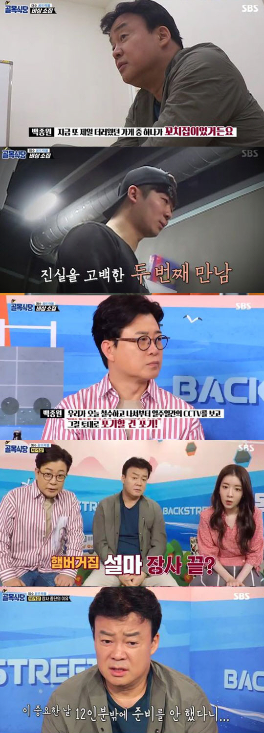 백종원은 "카메라 철수 후의 모습이 중요하다"고 강조하며 향후 일주일간 CCTV를 살펴본 뒤 "포기할 건 포기하겠다"고 냉정하게 답했다. 백종원의 갑갑한 속내가 그대로 드러났다.