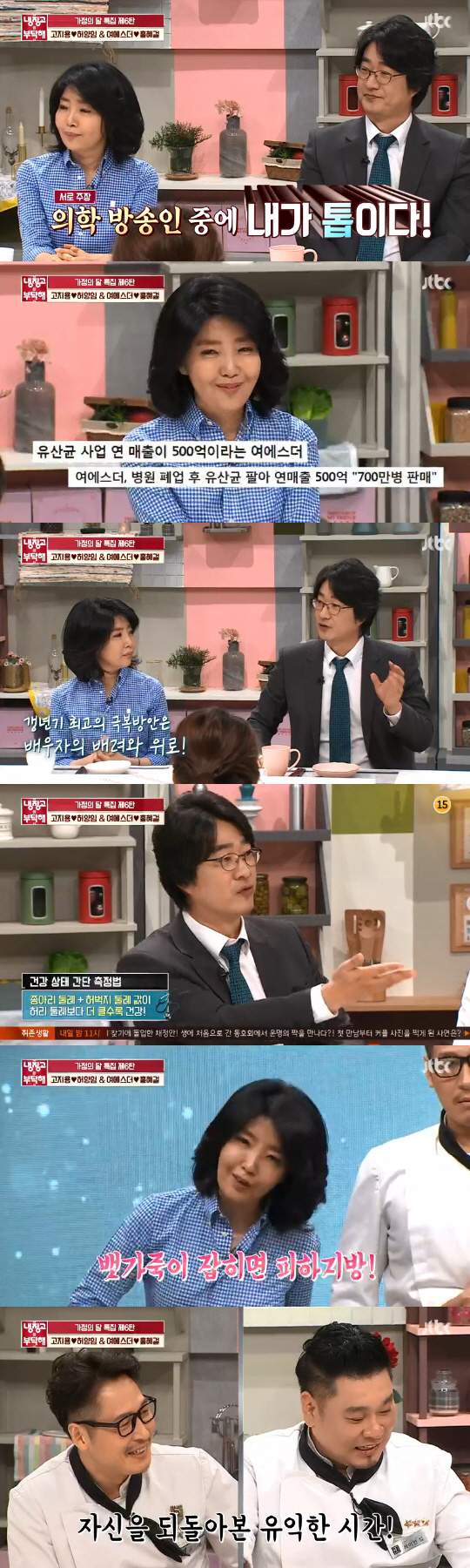이날 여에스더와 홍혜걸은 '냉장고를 부탁해'의 '장수왕'을 뽑았다. 홍혜걸은 "사람이 건강한지 아닌지 가장 객관적으로 알 수 있는 게 허리 둘레와 다리 둘레를 측정하는 거다"라고 설명했다. 종아리 둘레와 허벅지 둘레값이 허리 둘레보다 더 클수록 건강하다는 것.