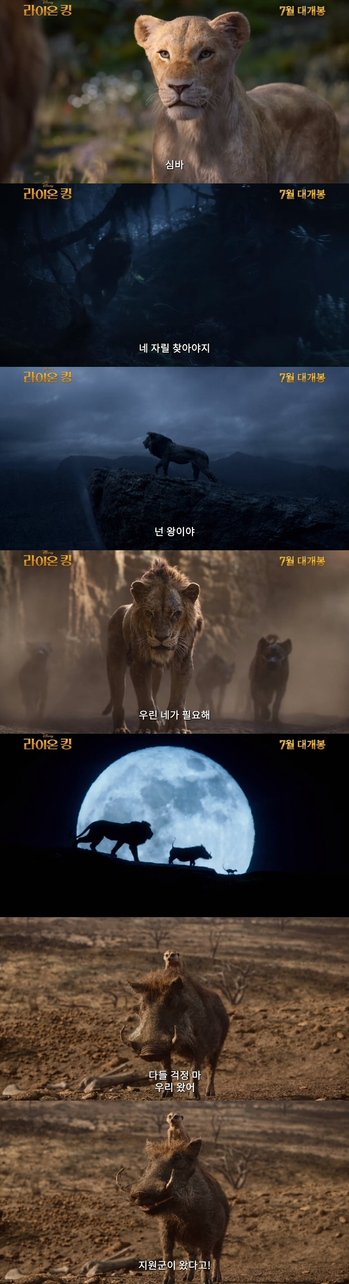 한편, 1994년 공개된 애니메이션을 실사화환 '라이온 킹'은 사자들이 지배하는 사바나에서, 아버지인 킹 무파사를 이어 왕이 될 사자 심바와 동료들의 운명과 모험을 다룬 작품이다. 도날드 글로버, 비욘세, 제임스 얼 존스, 치웨텔 에지오포, 세스 로건, 빌리 아이크너, 알프리 우다드, 존 카니, 존 올리버, 에릭 안드레 등이 목소리 연기에 가세했고 '정글북'을 만든 존 파브로 감독이 메가폰을 잡았다. 북미에서는 오는 7월 19일 개봉, 국내에서는 7월 중 개봉 예정이다.
