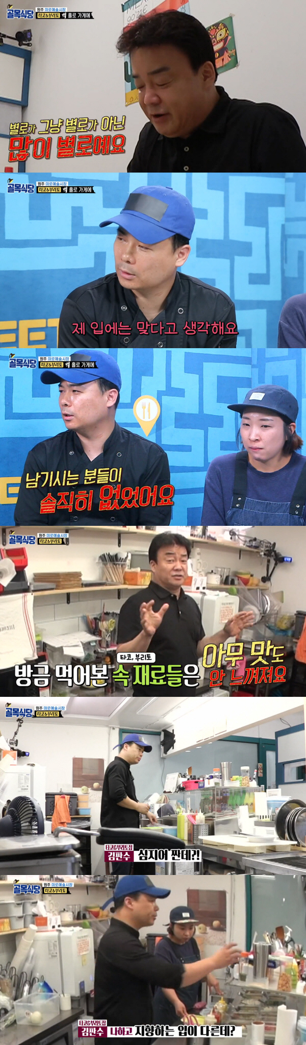 바로 백종원은 주방 점검에 나섰다. 백종원은 재료들을 하나씩 맛 봤다. 그는 "김밥이 맛있으려면 속재료가 맛있어야 한다. 속재료들도 간이 맛이야 하는데, 먹어 본 재료들은 아무 맛도 안 느껴진다"고 말했다.