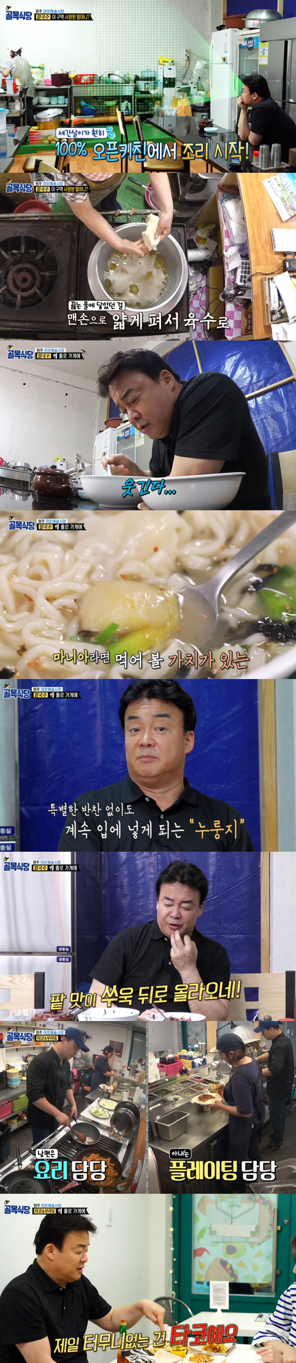 가게에 들어선 백종원은 칼제비(칼국수면+수제비)와 팥죽 시식에 나섰다. 칼제비를 맛 본 백종원은 "개인적으로 칼국수는 국물이 진한 것을 좋아하는데 국물이 안 진하다"면서도 "딱 누룽지 먹는 느낌이다"고 말했다. 그러면서 "이 칼국수의 맛은 다른 칼국수 맛집과 전혀 다르다. 이 맛은 이곳에서만 맛 볼 수 있다"며 "칼국수 마니아라면 한 번쯤 경험해 볼 맛이다"고 평가했다. 백종원은 "확실한 건 반죽이 좋다. 맛의 조화가 어느 것도 세지 않고 좋다"고 덧붙였다.