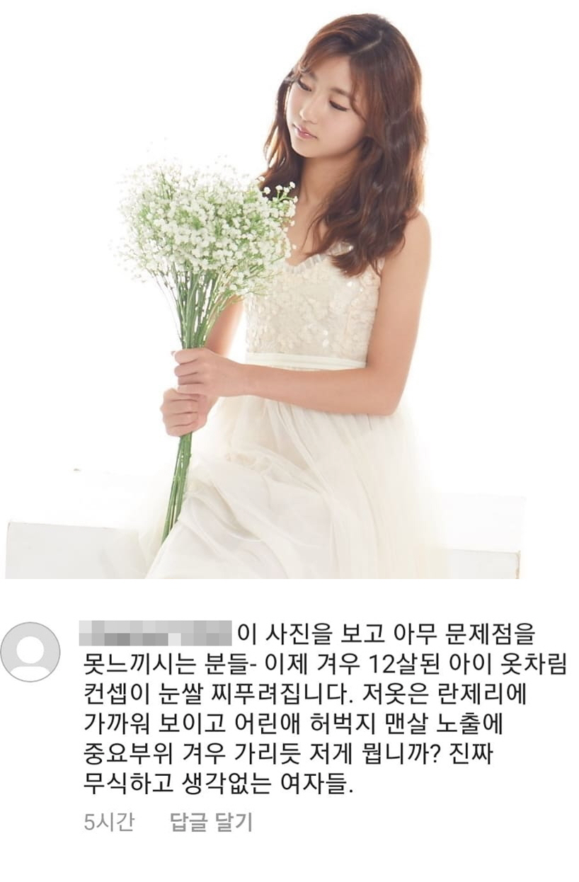 박연수가 캡처한 댓글을 보면 한 네티즌은 '이 사진을 보고 아무 문제점을 못 느끼시는 분들. 이제 겨우 12살 된 아이 옷차림 콘셉트가 눈살 찌푸려집니다. 저 옷은 란제리에 가까워 보이고, 어린애 허벅지 맨살 노출에 중요 부위 겨우 가리듯 저게 뭡니까? 진짜 무식하고 생각 없는 여자들'이라고 남겼다.
