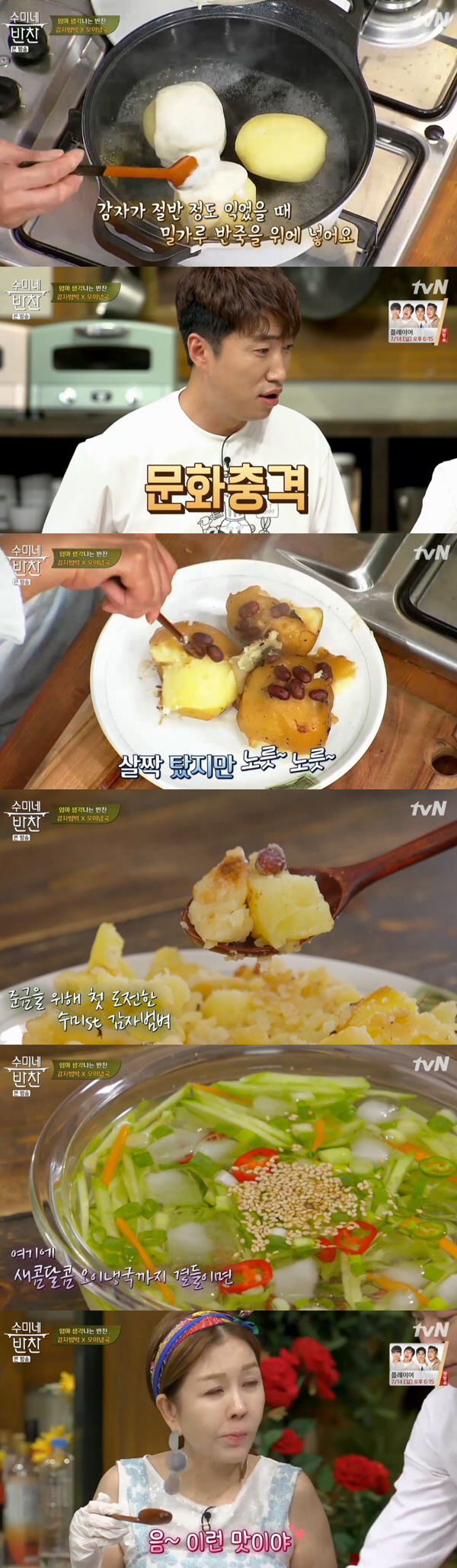 이에 김수미는 박준금을 위해 감자범벅에 첫 도전, 다소 생소한 감자범벅에 장동민과 셰프들은 궁금증을 드러냈다. 감자가 절반 정도 익었을 때 밀가루 반죽을 위에 올린다. 장동민은 "처음 본다"며 눈을 떼지 못했다. 감자가 익으면 감자와 밀가루를 함께 으깨 먹는 것이 바로 감자범벅. 여기에 새콤달콤 오이냉국까지 곁들여 시청자들의 침샘을 자극했다.