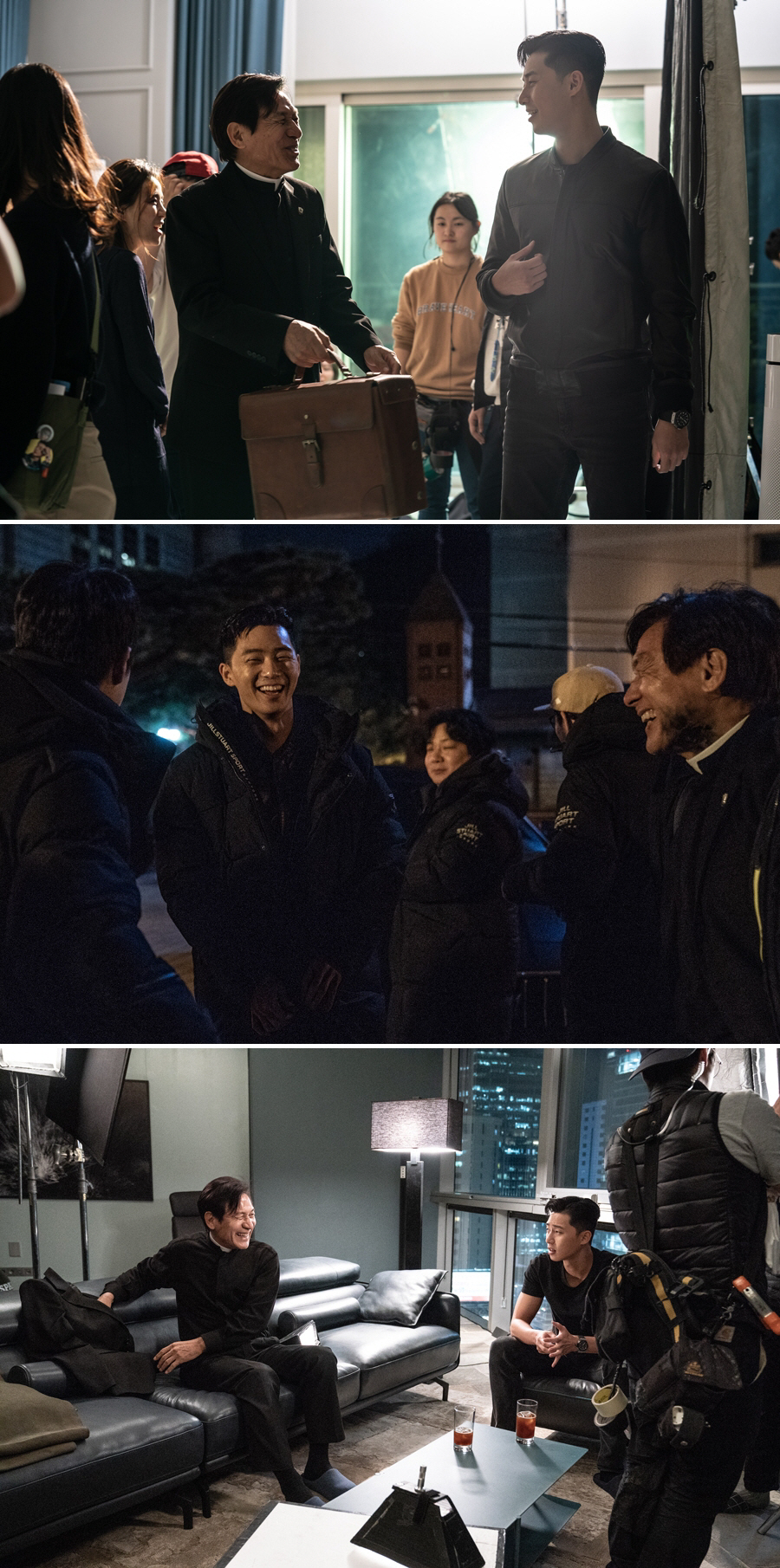 이번에 공개된 케미 스틸은 격투기 챔피언 용후 역 박서준과 구마 사제 안신부 역 안성기의 화기애애한 촬영 현장을 포착해 시선을 사로잡는다. 영화 속 강렬하고 카리스마 넘치는 모습과 달리 촬영 현장에서 웃음이 끊이지 않는 박서준과 안성기는 '사자'를 통해 세대를 뛰어넘는 특별한 호흡을 보여줄 것으로 기대를 모은다.