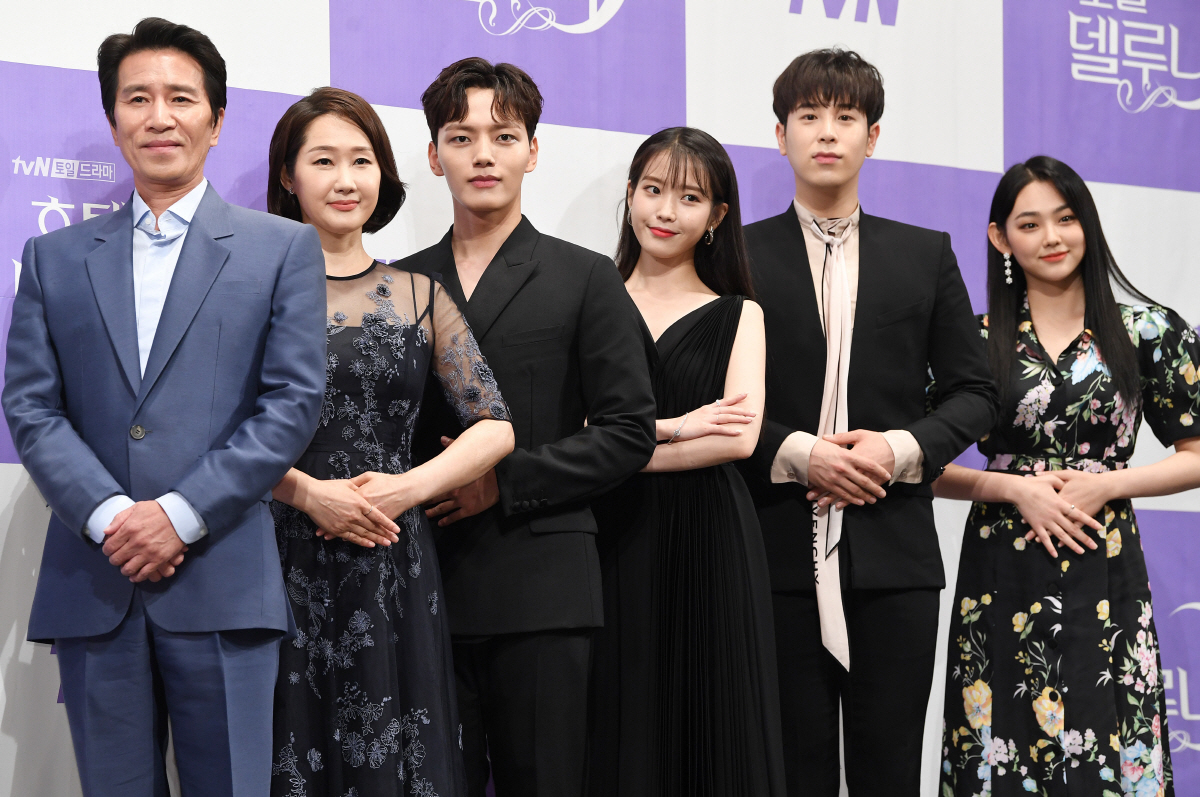 tvN 드라마 '호텔 델루나' 제작발표회가 8일 오후 서울 논현동 임피리얼팰리스 호텔에서 열렸다. 신정근, 배해선, 여진구, 이지은, 표지훈, 강미나(왼쪽부터)가 포즈 취하고 있다. '호텔 델루나'는 귀신 손님을 받는 호텔 사장(이지은)과 지배인(여진구)의 호러 로맨스를 그린 드라마다. 정재근 기자 cjg@sportschosun.com/2019.07.08/