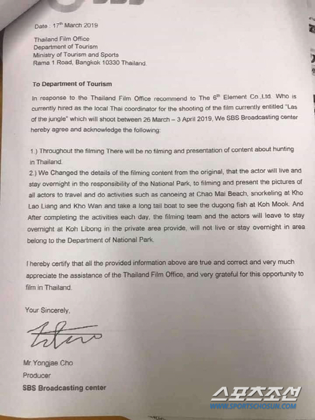 이 상황에서 현지 언론을 통해 '정글의 법칙' 제작진의 대표로 연출을 맡은 조용재 PD가 태국 관광청에 제출했다는 서류가 공개됐다. 서류에는 "촬영이 진행되는 동안 태국에서 사냥을 하는 모습을 촬영하거나, 방송으로 송출하지 않겠다"는 약속과 "촬영 원본을 편집해 배우들이 국립공원의 통제 하에 하룻밤을 머물게 되고, 카누를 타고 스노클링을 할 것이며, 긴꼬리배를 타고 듀공을 관찰하는 장면을 촬영할 것"이라는 협조 내용이 담겨 있다.