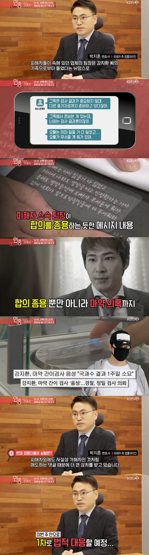 강지환 측은 피해자들에게 합의 종용을 했다는 의혹도 있는 상황. 박지훈 변호사는 "피해자들이 속해 있던 팀장은 강지환 씨의 가족으로부터 들었다는 뉘앙스로 '피해자들에게 불리한 증거를 수집하고 있다. 만나서 합의를 시도하지 않으면 강지환도 부인할 것이고 보상도 없다'고 말했다"면서 피해자의 소속 업체가 피해자들에게 보낸 메시지를 공개했다. 메시지에는 "강지환은 잃을 게 없어서 무서울 게 없다. 너희가 앞으로 닥칠 일들이 더 무섭지"라는 내용이 담겨있었다.
