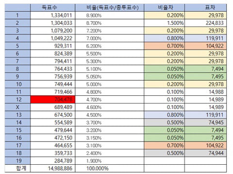 그런데 아래 표를 보십시오. 엠넷 주장대로 득표수를 득표율로 환산한 것입니다. 득표율을정리해 보면 소수점 둘째자리가 0 아니면 5 뿐 입니다. 이상하지 않으세요? 반올림하면 나오는 숫자는 0과 9 사이에서 다양해야지 왜 0과 5만 나오는 걸까요? 이것 때문에 저는 엠넷 해명이 틀렸다고 주장하는 겁니다.