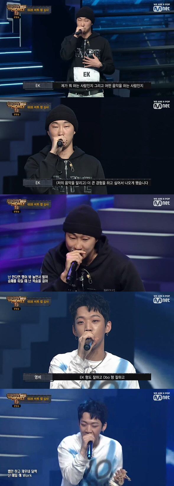먼저 지원자들이 뽑은 강력한 우승후보이자 프로듀서들조차 손꼽아 기다렸던 EK가 등장했다. 앞서 '쇼미더머니 트리플세븐'에서 활약했던 EK는 "지난번에 아쉽게 떨어졌었고, 제가 뭐 하는 사람인지 그리고 어떤 음악을 하는 사람인지 모르시는 분들이 많더라. 저의 음악을 알리고 더 큰 경험을 하고 싶어서 나오게 됐다"고 밝혔다. 강력한 우승후보를 묻는 질문에는 '영비'라고 답했다.