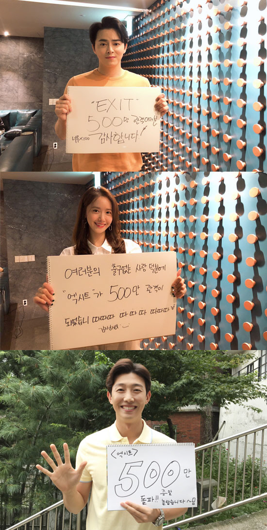이에 '엑시트'의 흥행 주역이자 대한민국 500만 관객을 웃고 울린 짠내 나는 캐릭터의 열연을 보여준 배우들과 이상근 감독이 흥행 감사의 손편지를 전했다. 조정석과 임윤아를 필두로 "'엑시트' 500만 관객 여러분 너무너무 감사합니다", "여러분의 출구 없는 사랑 덕분에 '엑시트'가 500만 관객이 되었습니따따따 따따따 따따따" 등의 재치 넘치는 감사 메시지는 물론, "500만 돌파 감사합니다", "당신의 사랑이 500만이 되었습니다! 저희가 그보다 더 다가가겠습니다. 감사합니다", "'엑시트' 500만 돌파! 정말 놀랍습니다!", "'엑시트' 500만 경축! 정말 감사드립니다! 오! 남용주의! 걱정마시고 달리세요!" 등 진심 어린 손편지를 남겨 화제를 모으고 있다.