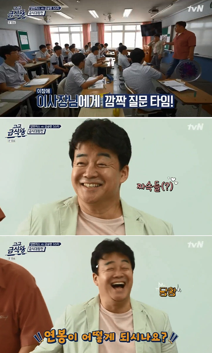 이날 방송에서는 '밥벤져스' 팀과 '급슐랭 3스타' 팀이 최종 우승자를 가리기 위한 마지막 급식 대결을 준비했다. 이에 점심시간 전, MC 백종원과 문세윤은 고등셰프들이 만든 급식을 직접 홍보하기 위해 시식용 음식을 들고 학생들을 찾아갔다. 예산고 학생들은 MC 깜짝 방문에 놀라는 것도 잠시, 곧 예상치 못한 반응을 보이며 두 사람을 당황케 했다. 학생들은 학교 이사장인 백종원을 향해 "연봉은 얼마예요?"라고 질문하는가 하면 "연봉 30억 아니냐"라고 추측해 백종원을 진땀나게 만들었다.