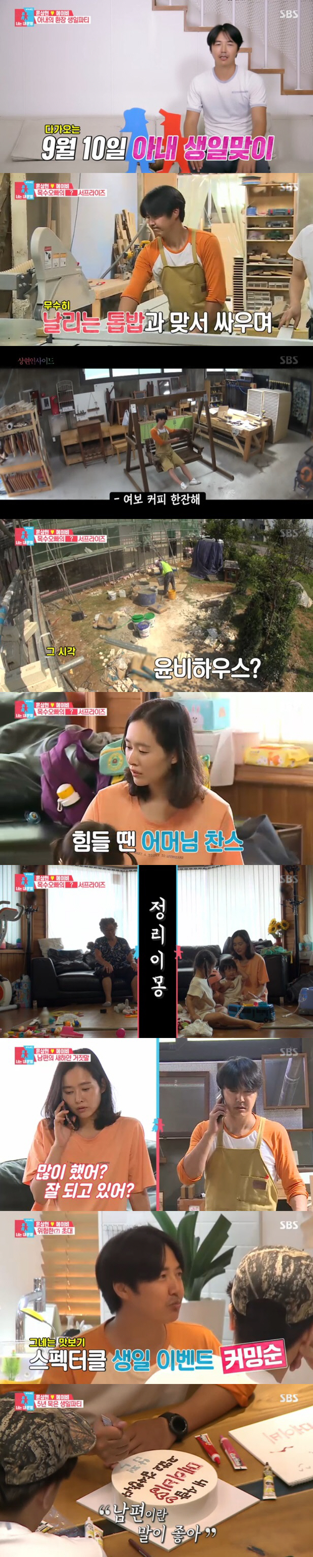 윤상현은 공방 사장님과 함께 대형 목재를 재단에 나섰다. 윤상현은 "애들 때문에 만드냐"라는 공방 사장님의 질문에 "와이프가 계속 갖고 싶어 했다"라며 만들고 있는 가구가 아내 메이비의 것임을 밝혔다. 알고 보니 곧 다가오는 메이비의 생일 선물로 몰래 만들기로 한 것.