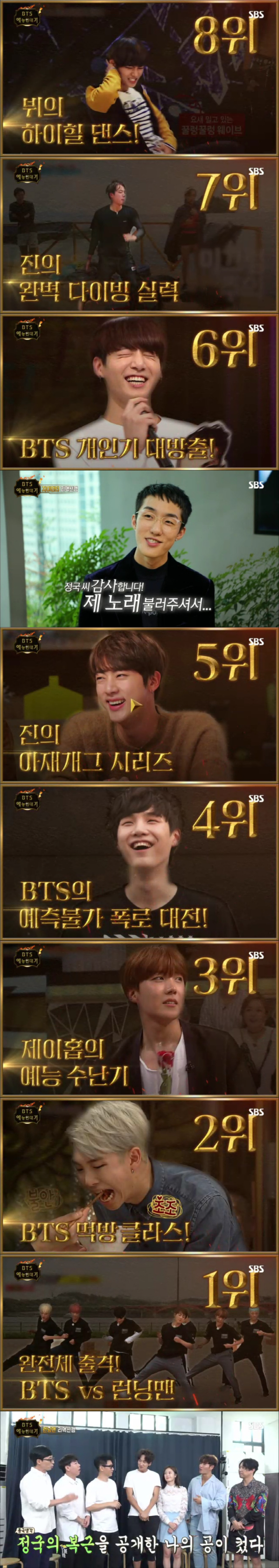 3위는 '스타킹' 스승의 날 특집에 출연했던 제이홉의 수난기가 선정됐다. 이어 '백종원의 3대천왕'에 출연한 'BTS의 먹방 클라스'가 2위를 장식했다. 대망의 1위로는 'BTS' 멤버 완전체가 출연했던 '런닝맨'이었다. 리액션캠을 본 런닝맨 멤버들은 김종국이 한 손으로는 슈가를, 다른 손으로는 정국을 제압한 뒤 이광수에게 매달린 지민까지 분리하는 모습을 보면서 다시한번 놀라워했다.