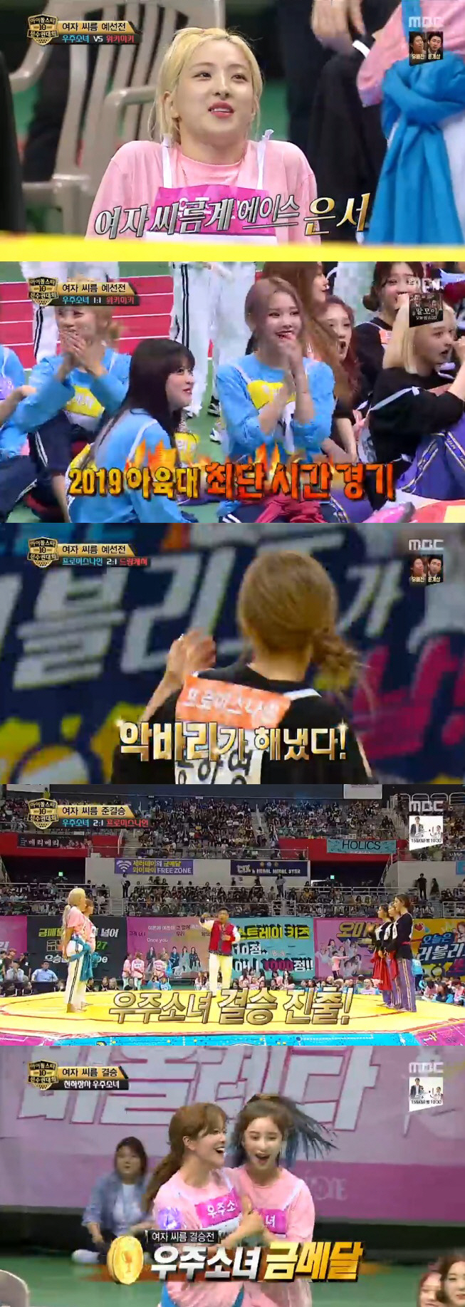 간식 타임이 끝난 후에는 여자 씨름 예선전이 진행됐다. 예선 첫 조는 우주소녀와 위키미키의 대결. 특히 은서는 '여자 씨름계 에이스'로 불리며 눈길을 모았다. 은서의 활약으로 우주소녀는 준결승에 진출했다. 프로미스나인 송하영은 '악바리'라는 별명 답게 가현을 제쳤고, 덕분에 프로미스나인은 준결승에 진출했다. 예선 마지막 대결은 모모랜드와 체리블렛. MC전현무는 "주이가 힘이 장사라더라"라며 모모랜드의 활약을 기대했다. 주이는 가볍게 상대 미래를 제쳤고, 경기 후에도 지친 기색 하나 없는 모습을 보여 놀라움을 자아냈다. 그러나 준결승엔 체리블렛이 올라갔다. 준결승은 우주소녀와 프로미스나인의 대결로 진행됐다. 1차전 마지막 경기는 '에이스' 은서와 '악바리' 송하영. 은서는 에이스 답게 이번에도 배지기로 송하영을 가볍게 눕히며 결승에 진출했다. 마지막으로 체리블렛이 결승에 진출하며 우주소녀와 맞붙었다. 미래와 은서의 치열한 경기 끝에 은서가 '씨름 최강자'로 등극, 금메달을 차지했다.