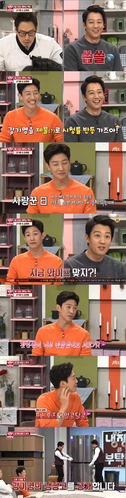16일 방송된 JTBC 예능 프로그램 '냉장고를 부탁해'에서는 10월 개봉하는 영화 '가장 보통의 연애'의 주연 배우 김래원과 강기영이 출연했다. 이날 방송에서는 결혼 5개월차 새 신랑 강기영이 부러움을 자아내는 신혼 생활에 대한 이야기를 들려줘 눈길을 끌었다.